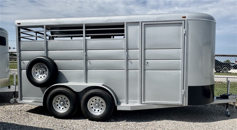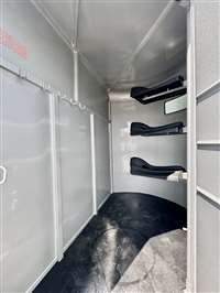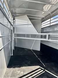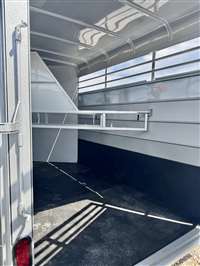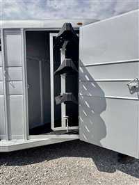 SALE, LAST ONE AT THIS PRICE , ON THE LOT NOW Color SILVER Weight 3220lbs 17' length, 7' tall, 6' wide Extra ft in tack area 38' Tack door ilo of 36" Slant dividers Escape door Floor mats in horse part and dressing room Rubber on rump side 2 dome lights 3 saddle racks 6 Bridle hooks Plexiglass track Outside tie hooks 3500lb Torsion axles 16" 10 ply radial trailer tires SPARE INCLUDED! Calico trailers are custom made to order, so if you don't see exactly what you want, we will be happy to quote you a price Trades considered - Financing available (WAC)- Nationwide delivery available TRAILER DEPOT OF SHAWNEE